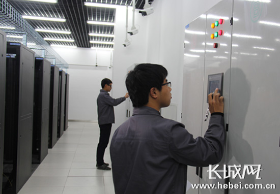 潤澤國際信息港機(jī)房內(nèi),技術(shù)人員正在對設(shè)備進(jìn)行調(diào)試。記者祝雪娟攝